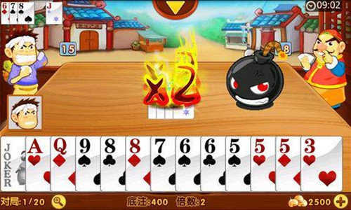 4、打牌(压牌)——合理的利用自已拥有的炸弹,多个炸弹的时候就得先看好哪些炸是牺牲品用来作为增翻之用,哪些炸是为自已或队友争取上手的机会,如果是为队友争取机会,一定要把传牌算好,以防传入敌手。(切记,不要见多个炸弹就心理松懈,这个是兵家之大忌)